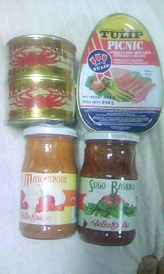 パスタソース(チーズとバジル)・缶詰ショルダーハム・ずわいがに缶です。